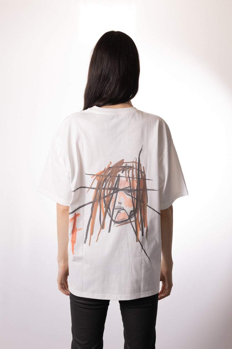 The T-shirt features Johnny Depp's painting "Alone Alone Alone" printed on the back. Described as "more of a scar than a face," the artwork is an integral part of the exhibition.