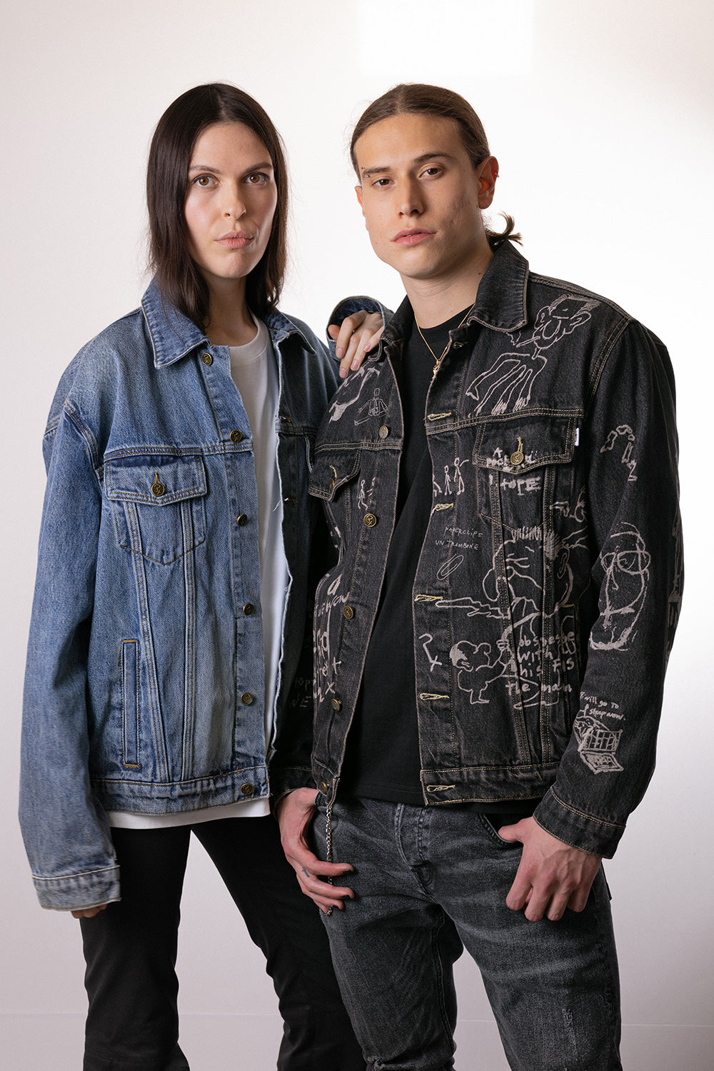 High-quality, durable 100% cotton denim. Full-body sketch design and interior panels featuring Johnny's sketch. Custom zinc alloy buttons. Bunny Man pocket tag. Buttoned cuffs. Discreet side pockets. Buttoned flap chest pocket. Exquisite finishing and high-quality washing.