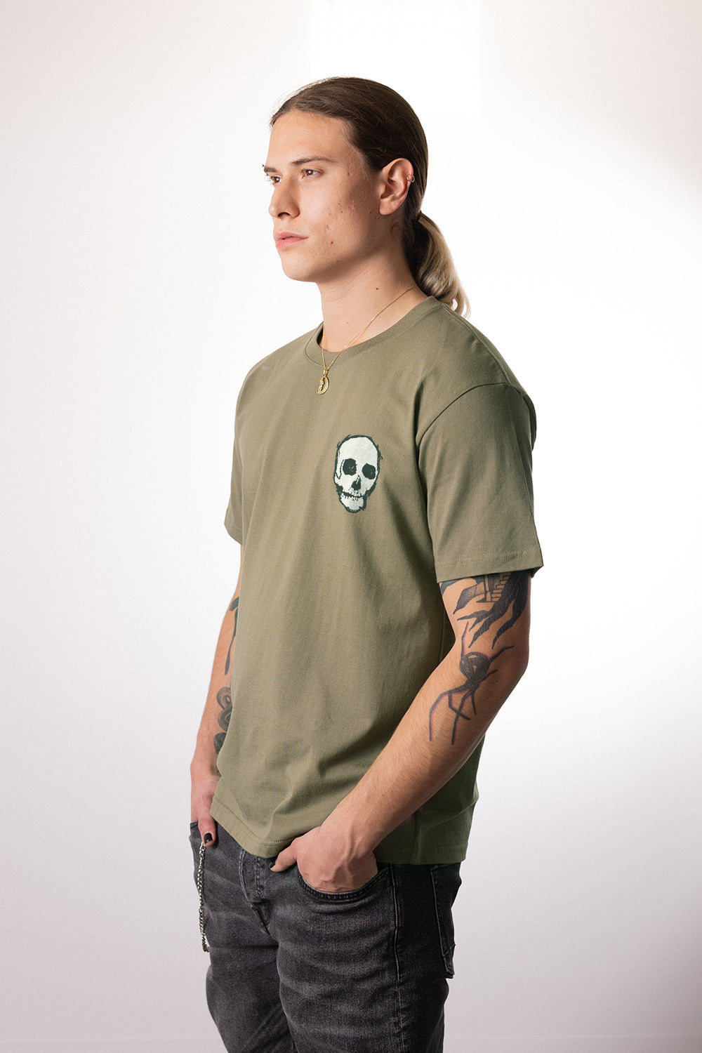 この緑の骸骨のデザインTシャツは、印象的なスケルトンが背面にプリントされています。ジョニー・デップの死と闇への強い関心がこのデザインに表れており、彼の家や写真に度々登場する頭蓋骨や骸骨を反映しています。
